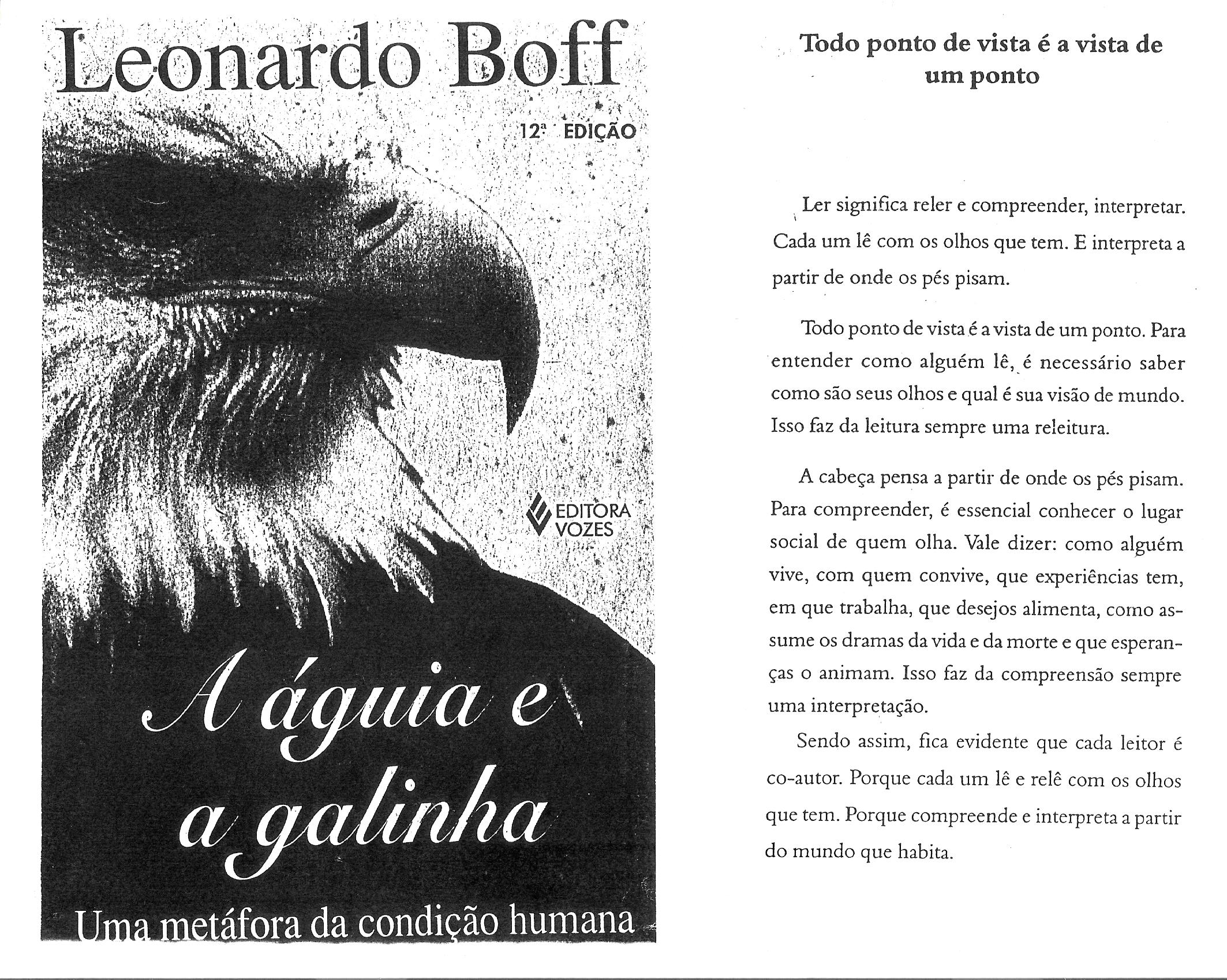 A partir do texto introdutório do livro “A águia e a galinha”, de Leonardo Boff, pode-se esboçar um raciocínio sobre a importância do ato de ler, de interpretar, decodificar o mundo. A alfabetização / letramento de um indivíduo perpassa valores desta natureza: mais do que a “soma de tijolinhos” (sílabas) o professor alfabetizador necessita de uma prática que permita efetivar a autonomia do aluno sobre a escrita e a leitura.